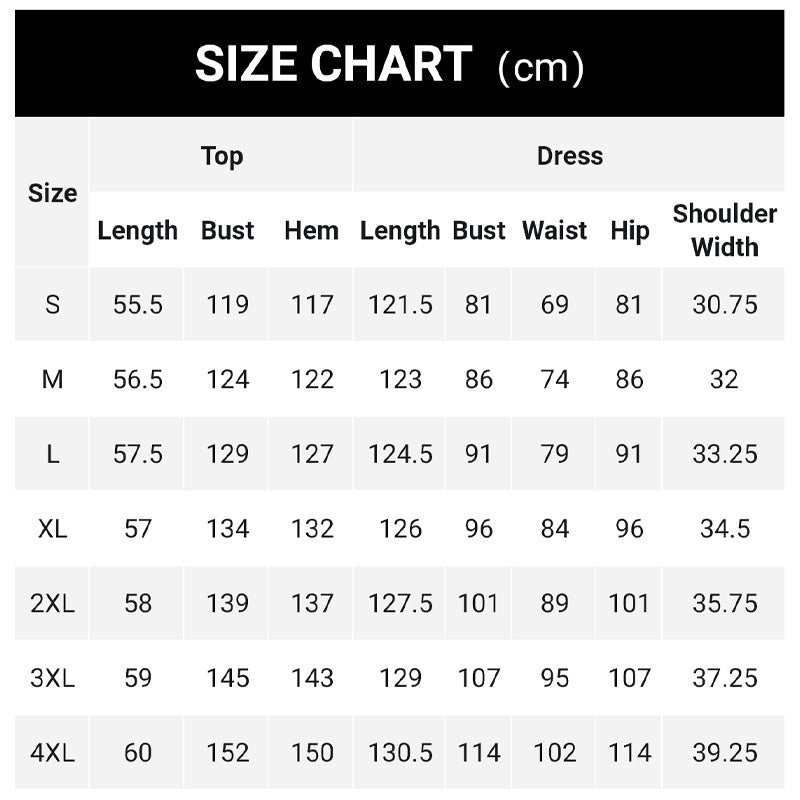 Taille Top – Longueur Top – Poitrine Top – Ourlet Robe – Longueur Robe – Poitrine Robe – Taille Robe – Hanches Largeur d’Épaules