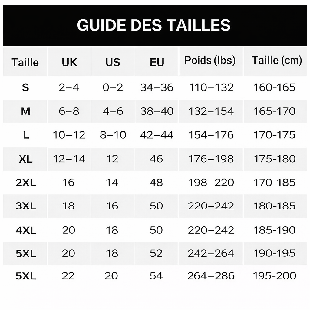 Taille UK US EU Poids (lbs) Taille (cm)